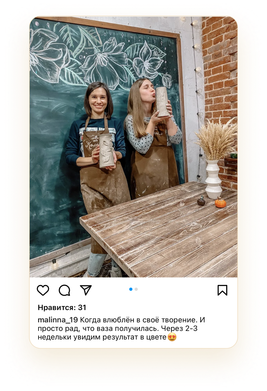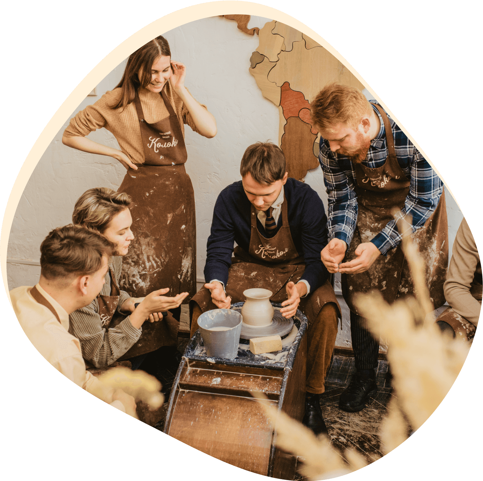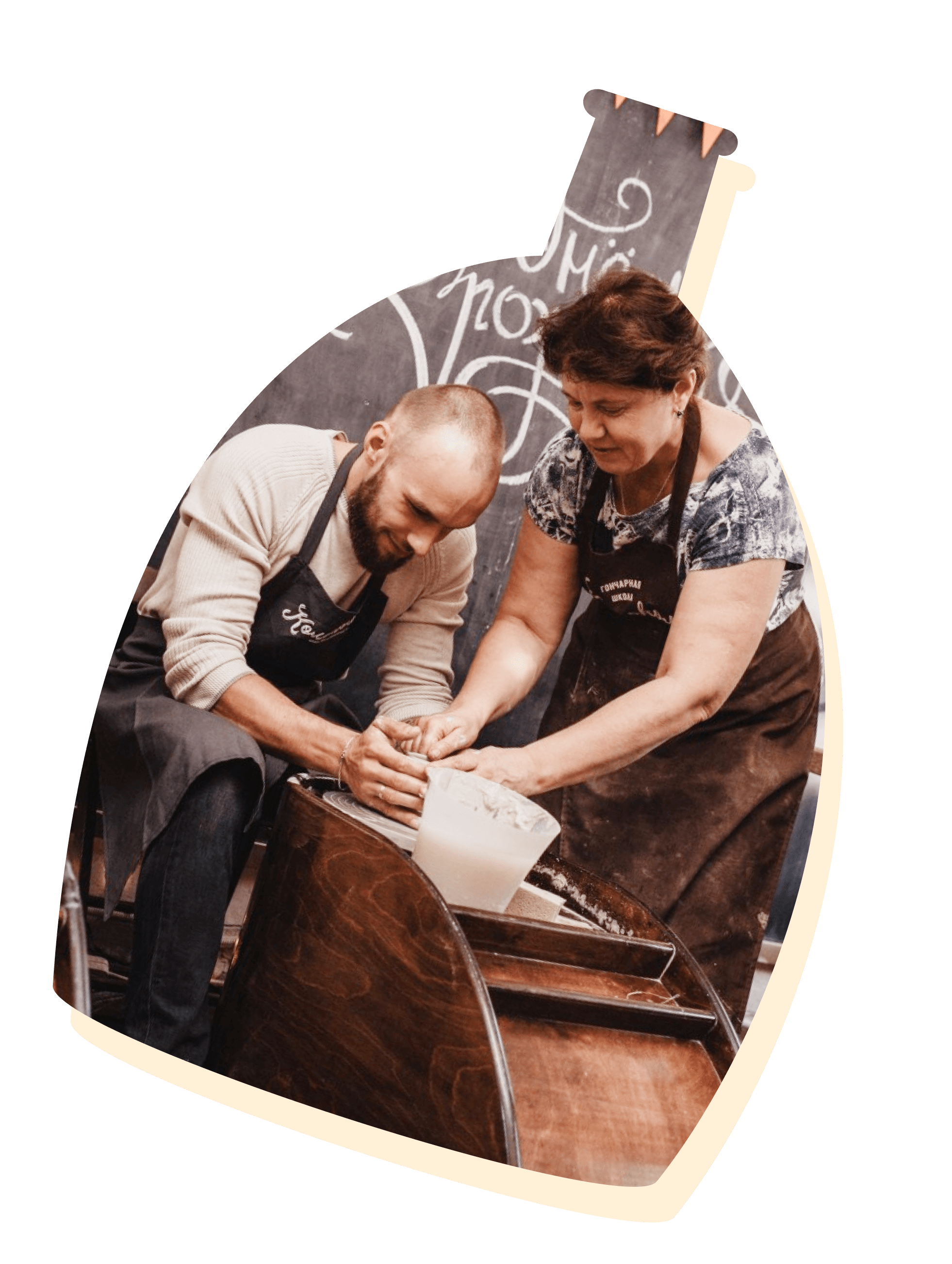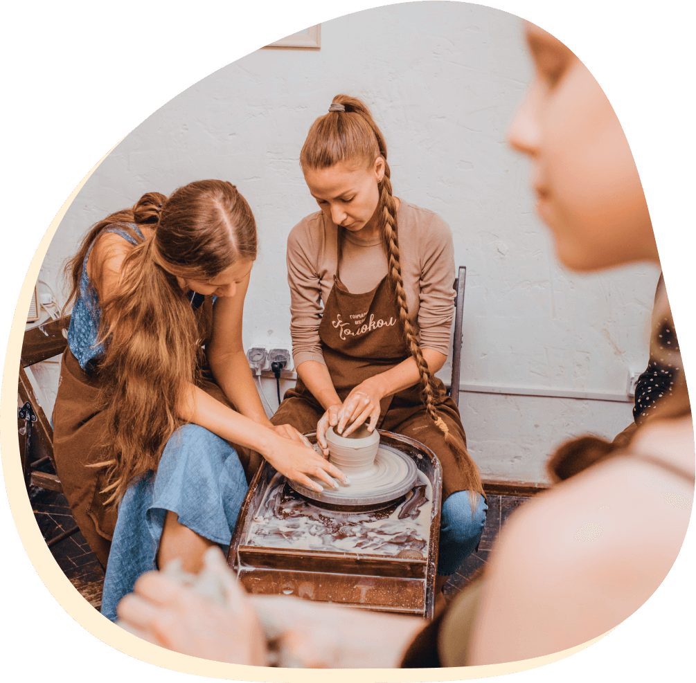 Создаёте все вместе кружки, тарелки или другие формы на гончарном круге или лепкой. Мастер уделяет внимание каждому.